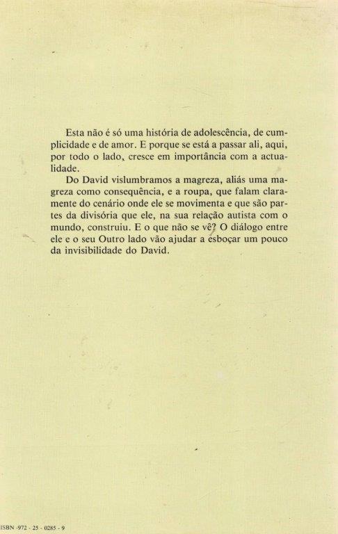 Do David vislumbramos a magreza, aliás uma magreza como consequência, e a roupa, que falam claramente do cenário onde ele se movimenta e que são partes da divisória que ele, na sua relação autista com o mundo, construiu. E o que não se vê? O diálogo entre ele e o seu Outro lado vão ajudar a esboçar um pouco da invisibilidade do David.